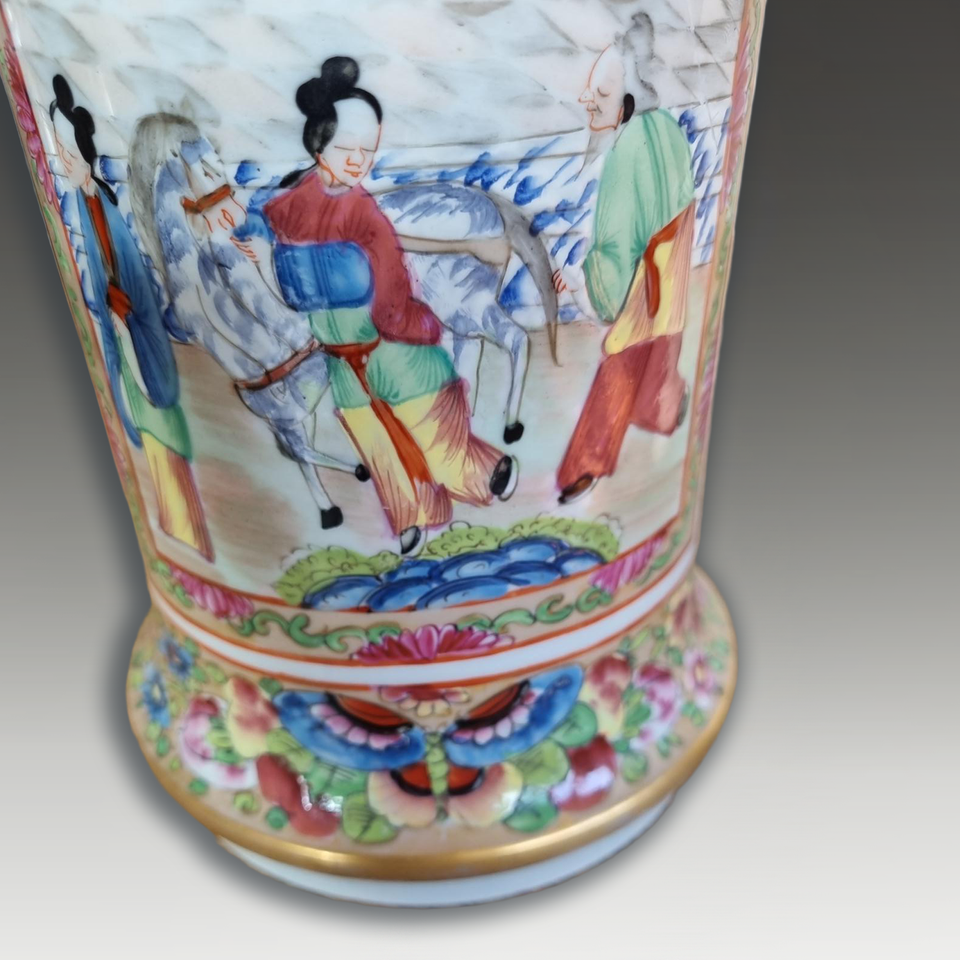 A really lovely, unusual and large Chinese"Rose Mandarin" porcelain trumpet vase with vibrant and highly detailed enamel and gilt decoration, showing very minimal wear. This type of “Famille Rose” item was made mainly for Europe or the USA, classifying it as Export ware. It is a fine example of Chinese Mandarin enamelled and gilded wares, likely dating from the 1830s during the Reign of the Emperor Daoguang (1820-1850). The vase is 13 inches (33 cm) tall and 18 cm (7 inches) in diameter.