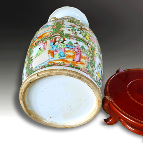 A really lovely Chinese Rose Medallion porcelain Very Large Canton Vase and stand. The vase is decorated with vibrant and highly detailed enamel and gilt decoration and the classic gilded Chimera Dragon handles. This type of “Famille Rose” vase was made in the Canton region mainly for Europe or the USA, classed as Export ware. It is a very fine example of this type of Rose Medallion enamelled and gilded vase, likely dating from around the 1850-60s, most probably made during the Reign of the Emperor Xianfeng (1850-1861). The vase features exquisite decoration around the borders, including Birds, Plants, Flowers, and Butterflies. The panels alternate, showing finely painted Palace scenes or panels of birds, flowers, and fruits. The vase is sold with a more contemporary hardwood Chinese stand, which complements the whole look of the piece. Dimensions: Height with Stand 56cm (22 inches)