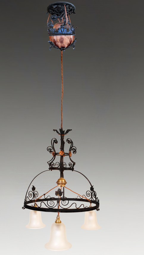 Art Nouveau Superb Copper And Wrought Iron Ceiling Chandelier Lamp. Circa 1900.