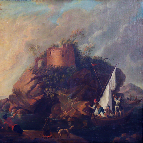 This painting is of the correct period and shows many similarities to the works of Claude Vernet. It is for this reason we are attributing this to the circle of Claude-Joseph Vernet