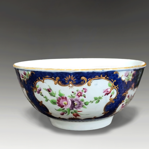A chance for 1st Period Dr Wall Worcester collectors to own a beautifully decorated bowl in the manner of James Giles but with a botanical theme. The work on the blue ground is quite outstanding as are the polychrome decorations.