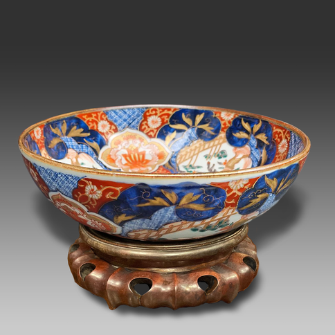 An opportunity to own a rare example of the highest quality Arita Imari Japanese Porcelain. A good size and Impressive piece. Comes with the antique hardwood stand as shown