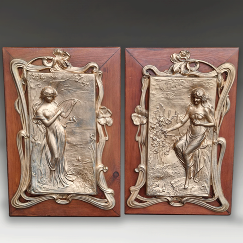 A pair of Art Nouveau gilded pewter (or similar metal) plaques from possibly the Czech Republic, dating back to around 1895. These exquisite pieces are framed and exhibit superb quality Art Nouveau fluid forms. The intricate detailing and elegant design are characteristic of the Art Nouveau style, making them a desirable addition to any antique collection.
